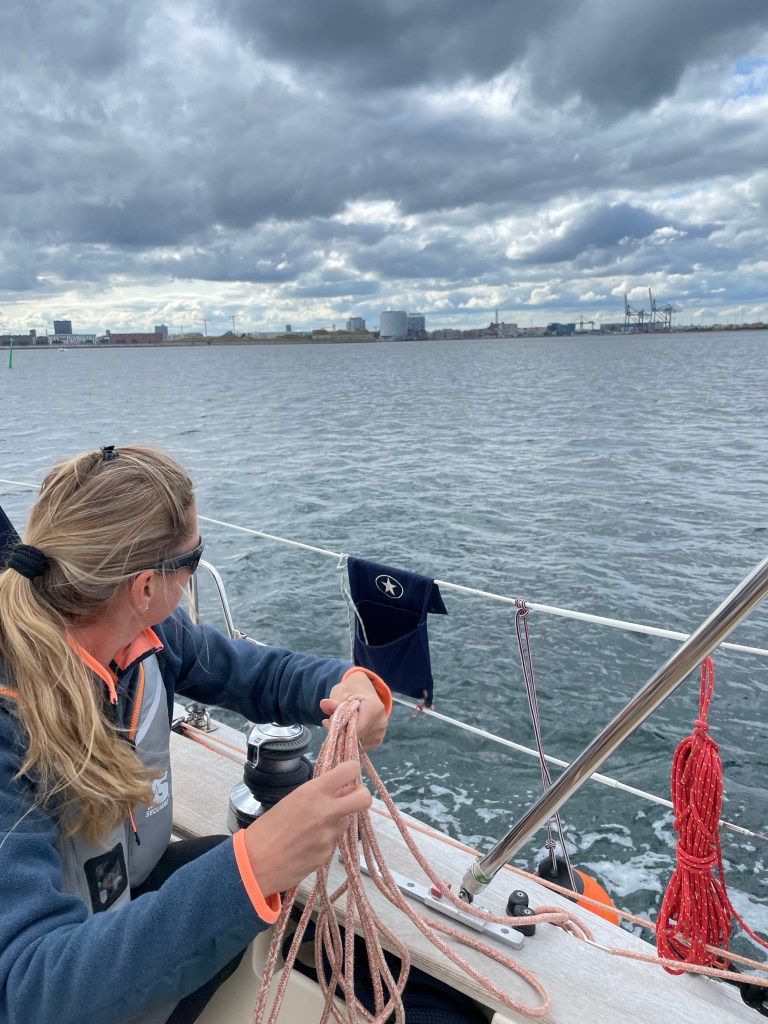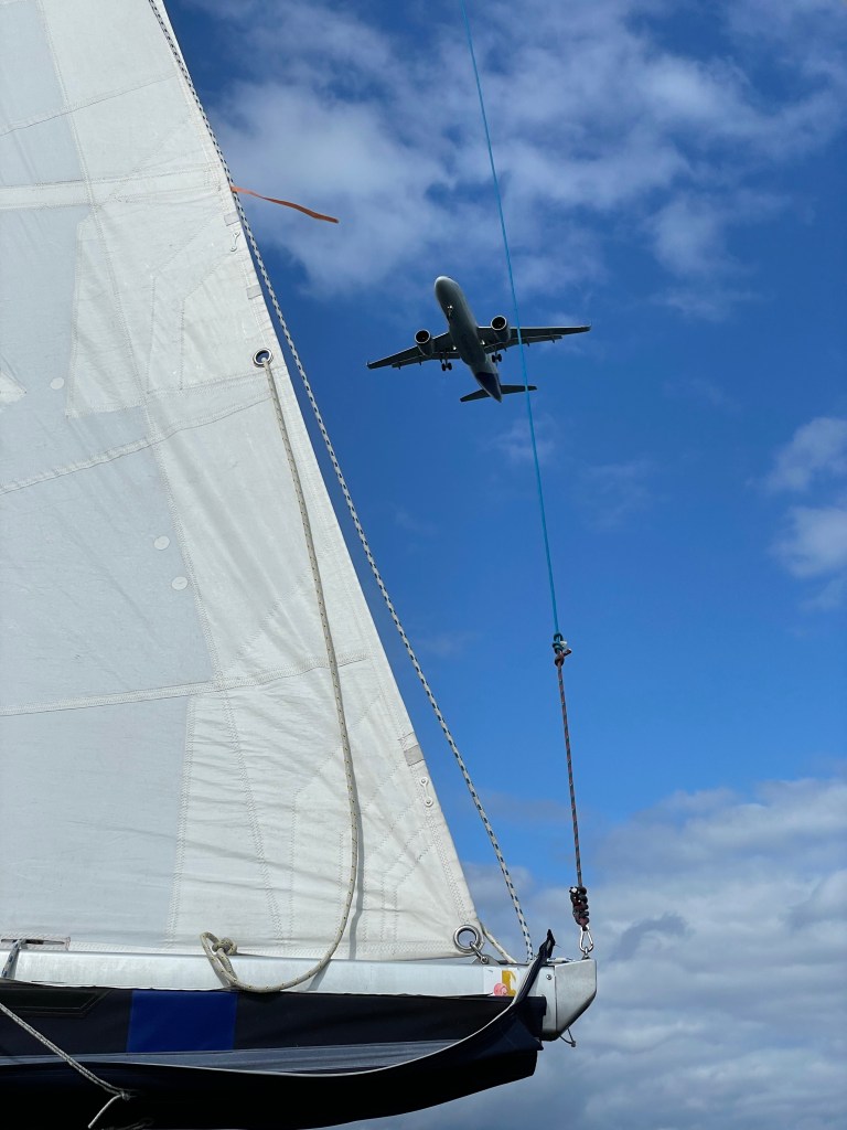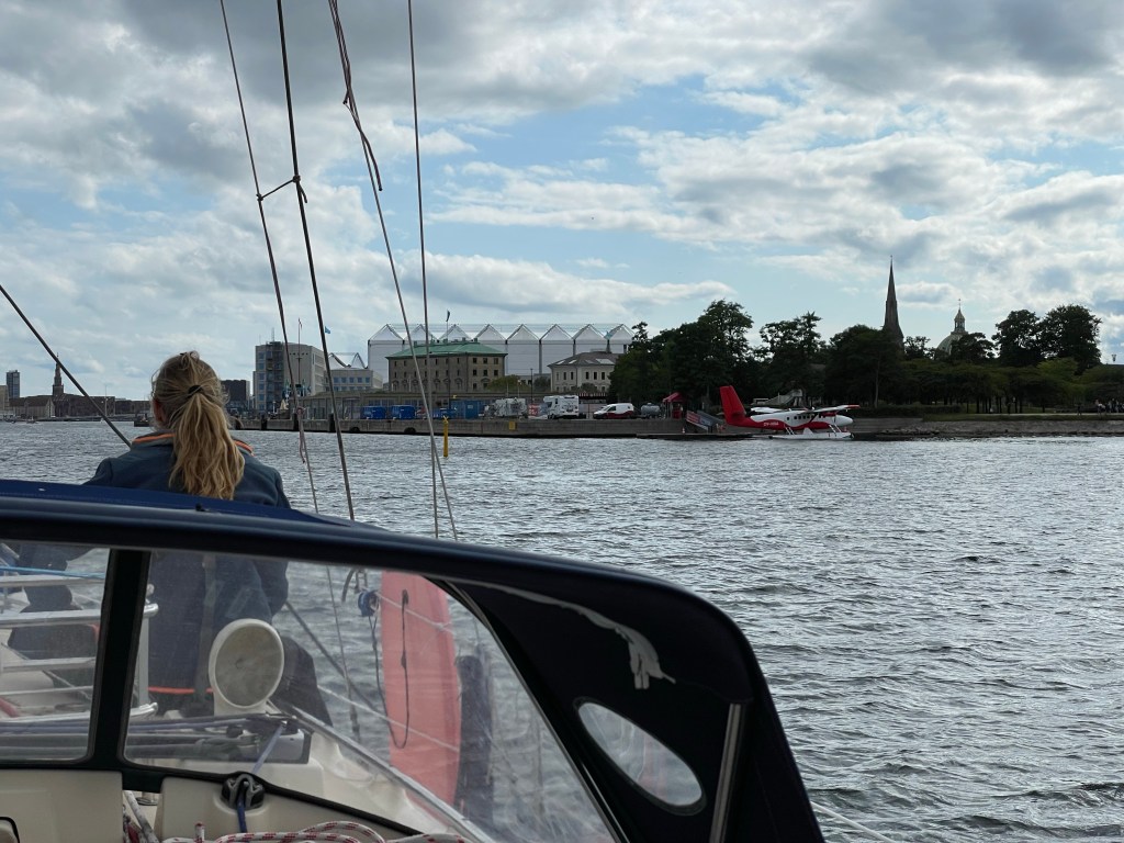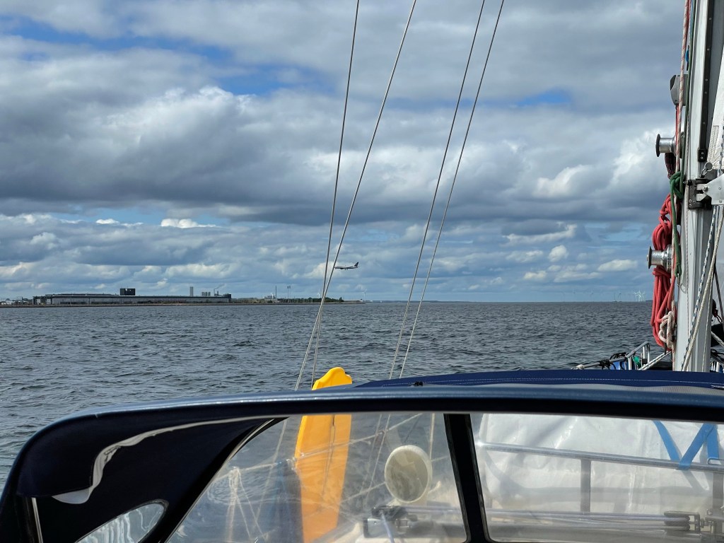 In der Landabdeckung vom Fischerort Dragør nimmt endlich die unangenehme Welle ab und auch der Wind etwas. Wir setzen nun auch das Großsegel und können vorbei am Flughafen die ganze City hoch segeln.