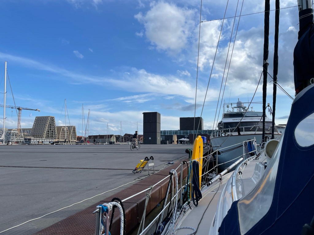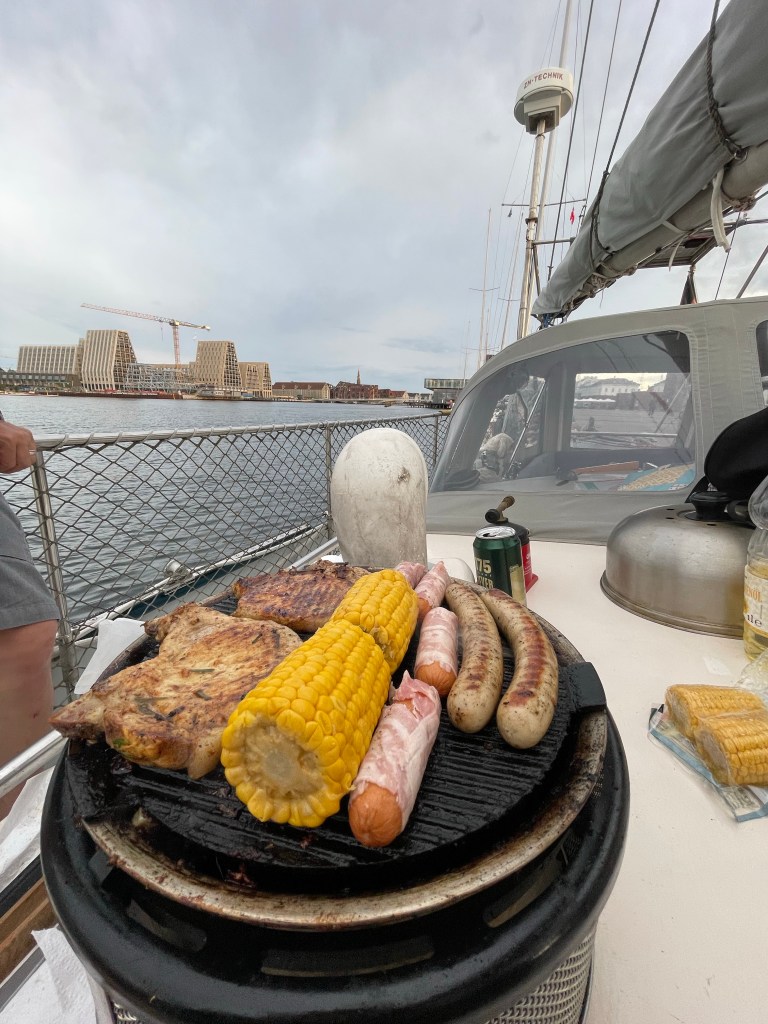 Dann biegen wir ab und passieren die kleine Meerjungfrau und steuern bis Downtown. Gegenüber des Opernhauses ist ein großes Becken und eine Mega Plattform mit Parkhaus darunter im Wasser. Dort können wir anlegen und haben es nur wenige Schritte bis in die Fußgängerzone. Gegenüber liegt eine Superyacht wie am Mittelmeer. Als sie später weg ist, merken wir, dass gleich dahinter das Schloss Amalienborg liegt, wo die Königsfamilie residiert. Da haben wir nicht die schlechteste Nachbarschaft. Abends grillen wir auf der Yuendumu und saugen neben dem Großstadtflair auch den ein oder anderen Gin-Tonic auf. Morgen steht Stadterkundung auf dem Programm.