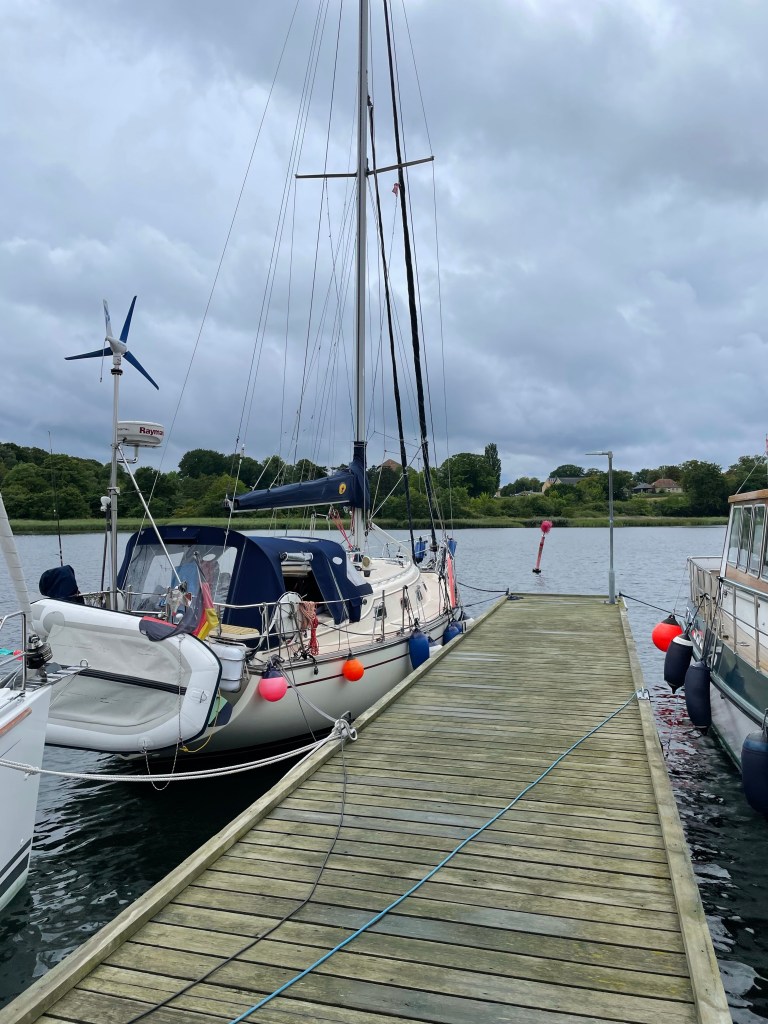 Zum Glück bleibt es bei ordentlichem Regen und nassen Klamotten. Wir bekommen mit beiden Schiffen einen Liegeplatz am Stegkopf und können aufatmen. Schnell wird die Kuchenbude wieder aufgebaut.