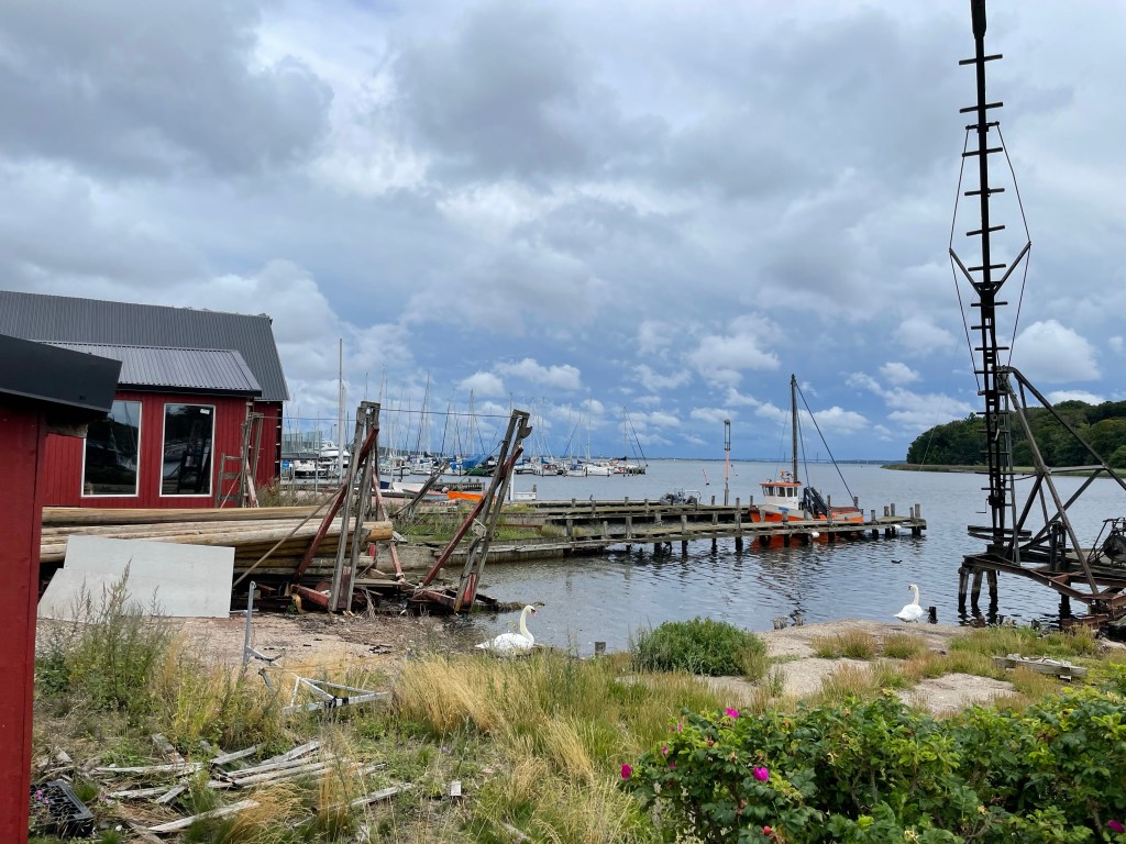 Wir schieben uns gefühlt im Zeitlupentempo mit 3 Knoten Vordingborg entgegen. Dort wollen wir einen Zwischenstopp machen, wenn wir einen Platz mit genug Tiefgang ergattern. Der Hafen soll nämlich sehr flach sein. Als wir den Hafen ansteuern kommt natürlich eine schwarze Wolkenwand auf uns zu. Schnell nehmen wir doch die Kuchenbude weg, um beim Anlegen im Unwetter bessere Übersicht zu haben.