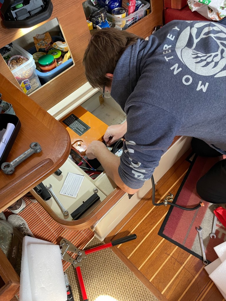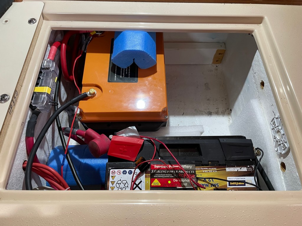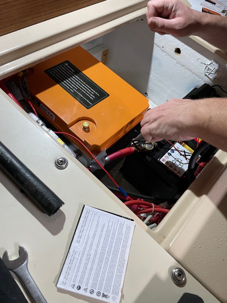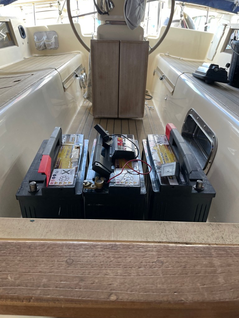 Mein elektrisch versierter Freund Christoph übernahm freundlicherweise den Einbau. Alles klappte gut und Laden sowie Entladen funktioniert mit den Unterschiedlichen Energieerzeugern an Bord. Wir hoffen, dass sich die Batterie auf Törn bewährt und im Staufach wäre sogar noch Platz für eine Zweite.