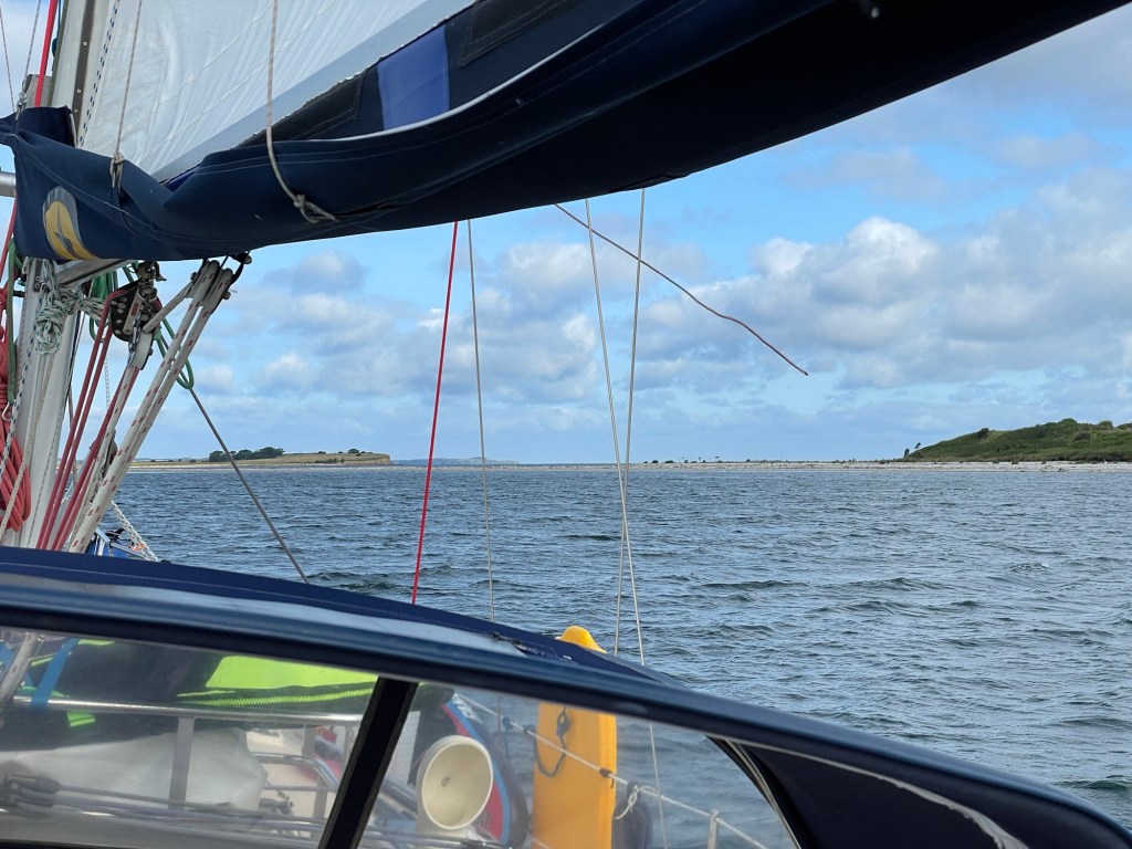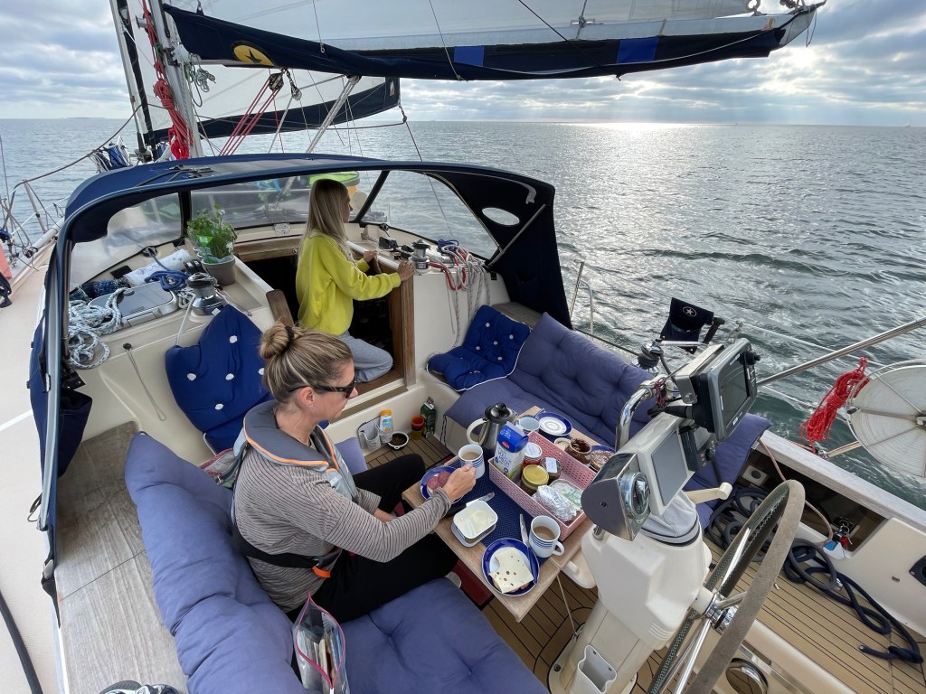 Am Donnerstag mussten wir schon morgens um Acht aufbrechen, da unsere Nachbarn los wollten. Wir setzen die Segel und richteten den Bug auf Amwindkurs nach Norden. Unter Land konnten wir bei wenig Welle sogar frühstücken.