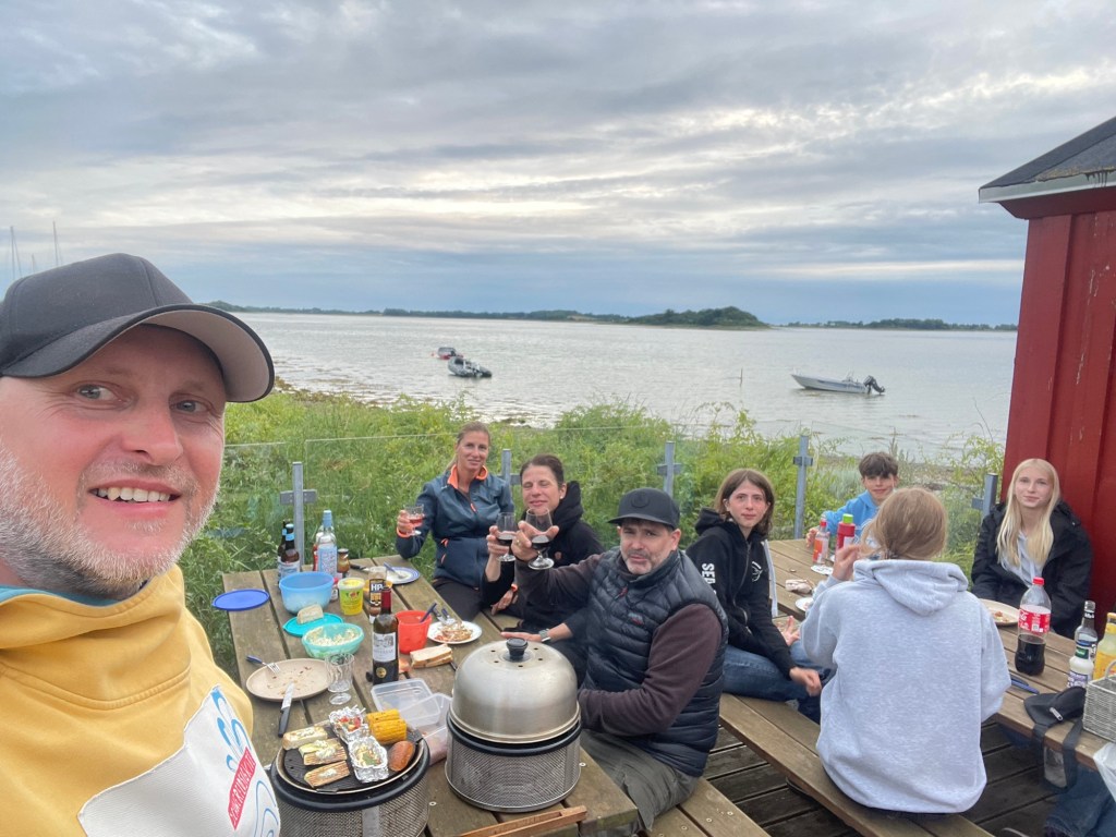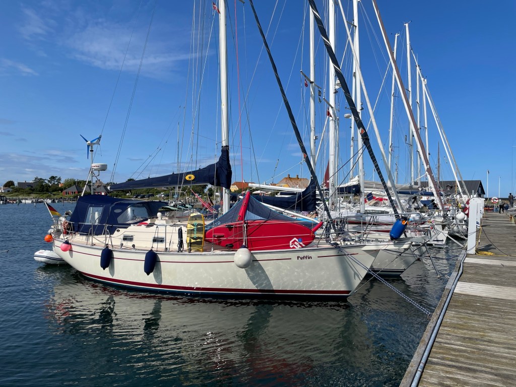 Wechselten die Genua dann gegen unsere Kutterfock und mit Motorhilfe kreuzten wir gegen Wind und Welle mühsam auf, um das Kap und die Untiefen zu passieren. Aber auch danach mussten wir hart an den Wind, um an der Westseite von Tunø vorbei zu kommen. Ein bisschen Genua half mit aber mit den gerefften Segeln kamen wir nicht hoch genug an den Wind. Wieder musste der Motor mit ran, um die Inselspitze passieren zu können. Neptun hatte bei den Kindern, die seit der Abfahrt unter Deck saßen, dankbare Opfer gefunden. Es gab Putzbedarf auf dem Leedeck. Um den Kurs auf unser Ziel Hou halten zu können, blieb der Motor für die letzten 6 Seemeilen mit an. Die Winddüse drehte nochmal richtig auf und schickte diese Böen und reichlich Salzwasser über das Deck. Als wir nach 25 Seemeilen endlich den schützenden Hafen erreicht hatten, erwachten die Lebensgeister langsam wieder. Morgen werden wir uns dann wohl erstmal erholen, denn es soll noch weiter blasen.