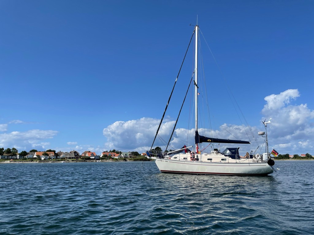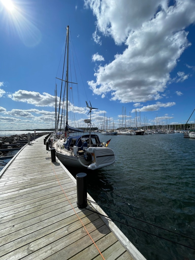 Um 9 Uhr gingen wir Anker auf und setzten das Groß gleich im ersten Reff. Es sollte nämlich über den Tag ordentlich auffrischen bis auf 6-7 Windstärken. Durch den frühen Start hofften wir noch auf moderate Bedingungen am Nordkap von Samsø. Hart am Wind schüttelten uns Böen und Seegang kräftig durch.