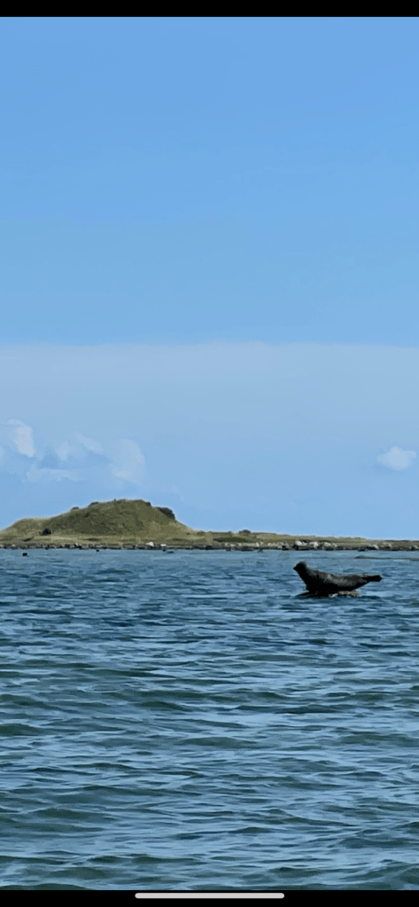 Da der Samstag wieder schön sonnig werden sollte, verholten wir uns nach dem Frühstück in die Ankerbucht. Es blieb allerdings recht kühl, so dass wir nicht ganz so badefreudig waren. Dafür machten wir eine Ausflug mit unserem Beiboot hinüber zur steinigen Landzunge. Dort hatten unsere Freunde Robben gesehen. Auch wir hatten Glück und konnten einer Robbe recht nah kommen, die sich auf einem Stein sonnte.