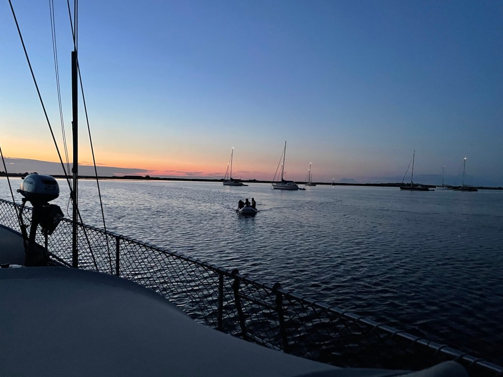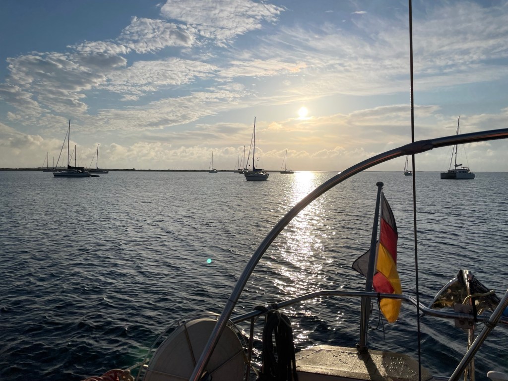 Heute morgen war ich früh wach und schaute nach den Nachbarbooten. Die waren wirklich deutlich dichter gekommen. Erstmal wach werden mit einem Bad im Meer und schon bald dufteten Kaffee und frische Brötchen, so dass auch die Mädels den Weg aus der Koje fanden.