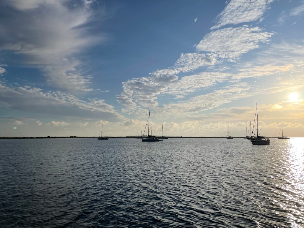 Abends füllte sich die Bucht und zwei Boote rückten uns ganz schön auf die Pelle. Der Wind sollte nachts drehen. Da hofften wir, nicht noch Fender ausbringen zu müssen. Der Wind legte sich aber erstmal und wir wanderten am Strand und grillten abends mit tollem Sonnenuntergang auf der Yuendumu.