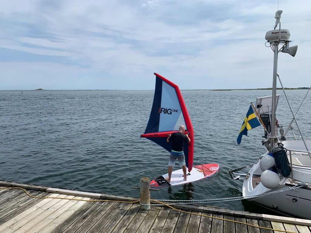 Um 10 Uhr machten wir im idyllischen Langør am Nordrand der großen Lagune fest. Die Yuendumu folgte zweieinhalb Stunden später auch. Bei frischem Wind und Sonnenschein baute ich mein Surfsegel fürs SUP auf und ging auf eine Erkundungskreuz durch die flache Lagune.