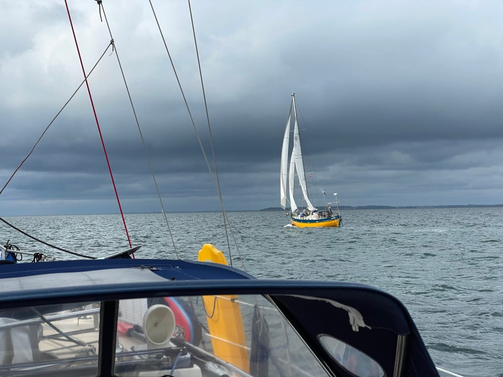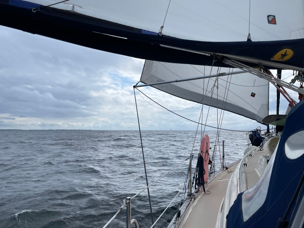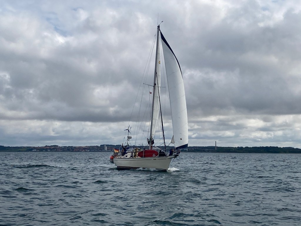 Der kleine Belt liegt hinter uns. Nach kurzem Übernachtungsstopp in Assens haben wir am Sonntag nach morgendlichem Gewitter die Segel gesetzt. Raus aus dem Belt und um die Ecke bis nach Faaborg sollte es gehen. Erst schwächelt der achterliche Wind etwas und gemächlich ziehen wir gemeinsam mit der Yuendumu unsere Bahn. Genua ist ausgebaumt. Am Himmel bedrohlich dunkle Wolken.