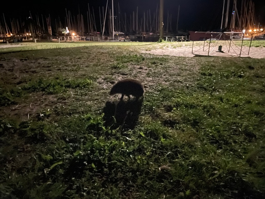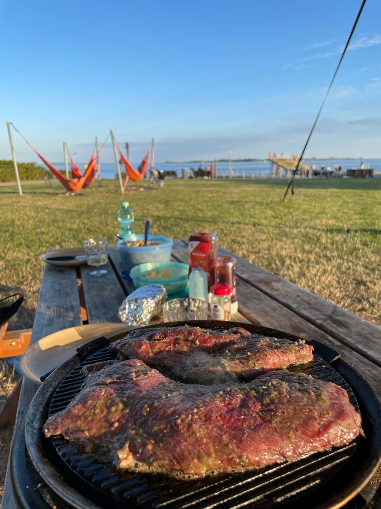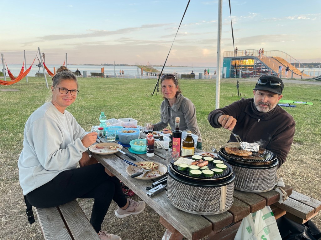Abends verholten wir uns zu den Picknick-Plätzen am Spielplatz und packten unsere Grills aus. Reichlich gefüllte Paprika und Zucchini füllten unsere Bäuche mit Blick auf die untergehende Sonne und später noch den schönen Sternenhimmel. Da kam sogar noch ein Igel zu Besuch.