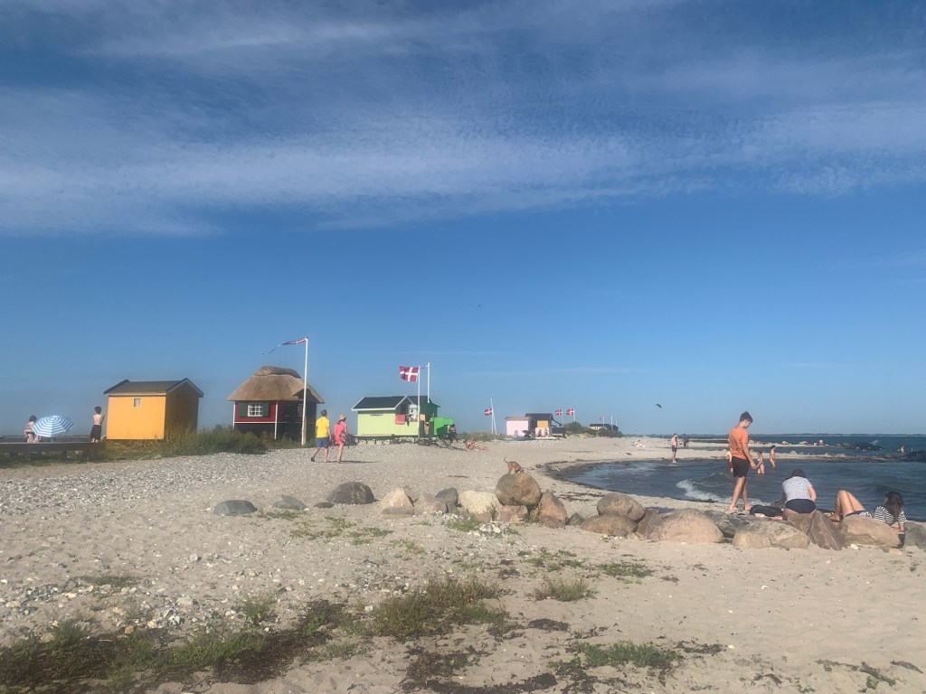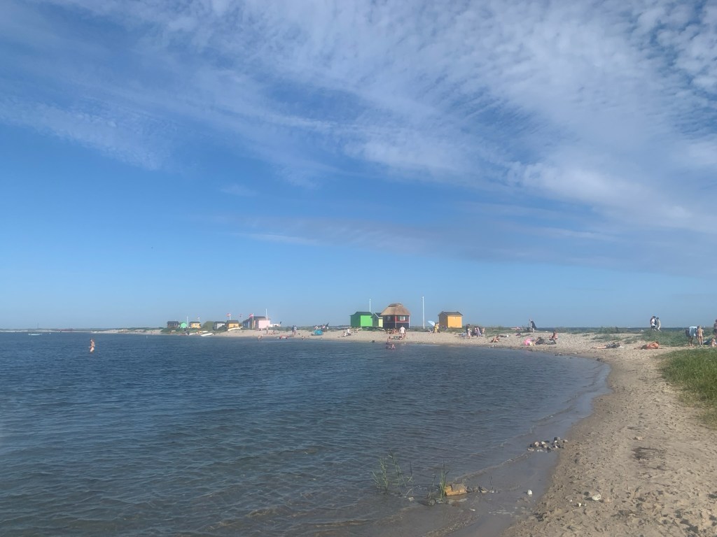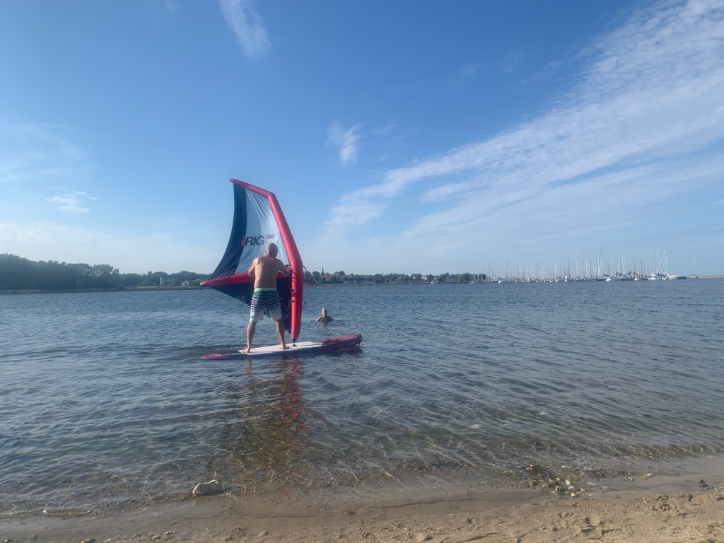 Aufgrund des schönen Sommerwetters machten wir im Hafen gleich Schlauchboot und SUP fertig, um über die Lagune zum Strand zu fahren. Die bunten Badehǎuschen waren wieder neu aufgebaut, nachdem vergangenen Herbst die Sturmflut alles zerstört hatte. Ich pumpte mein Segel auf und nutzte den Wind, um über die Lagune zu surfen, während die Mädels in der Sonne brutzelten.