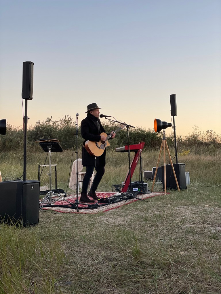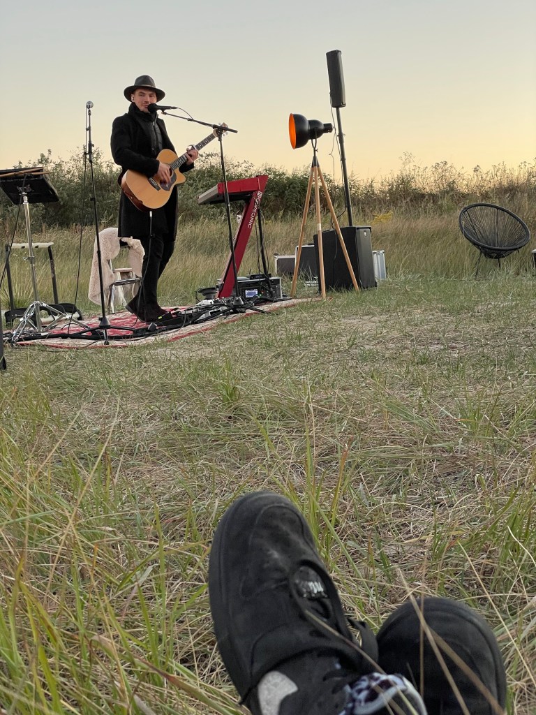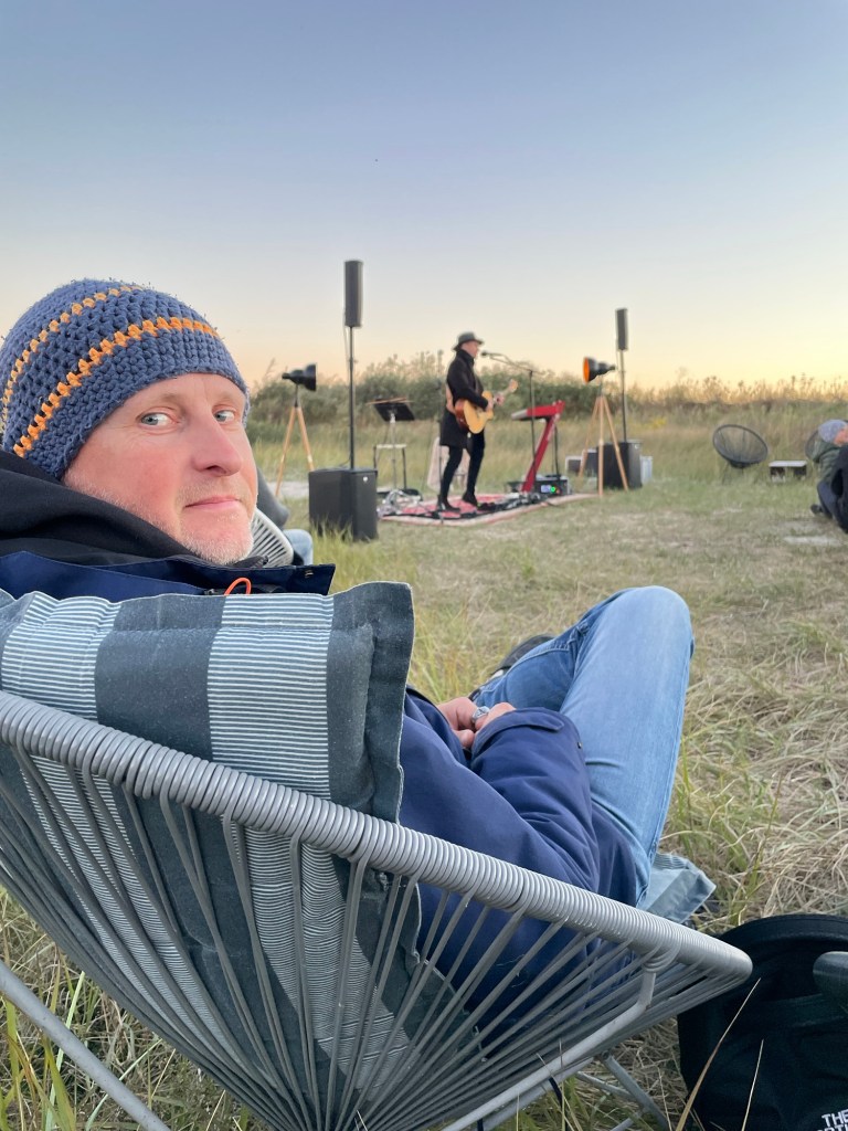 Abends hat sich der Wind gelegt und dick eingepackt mit Decken finden wir ein schönes Plätzchen auf Sesseln direkt neben der Naturbühne im Sand. Das Konzert ist gut besucht, so dass es voll wird am Getränkestand. Wir löffeln heißen Eintopf und genießen die toll gesungenen Songs von ÖXL.