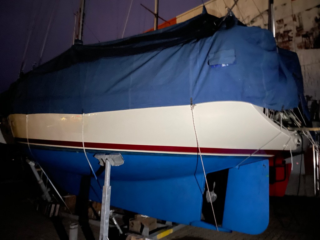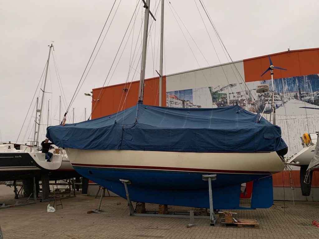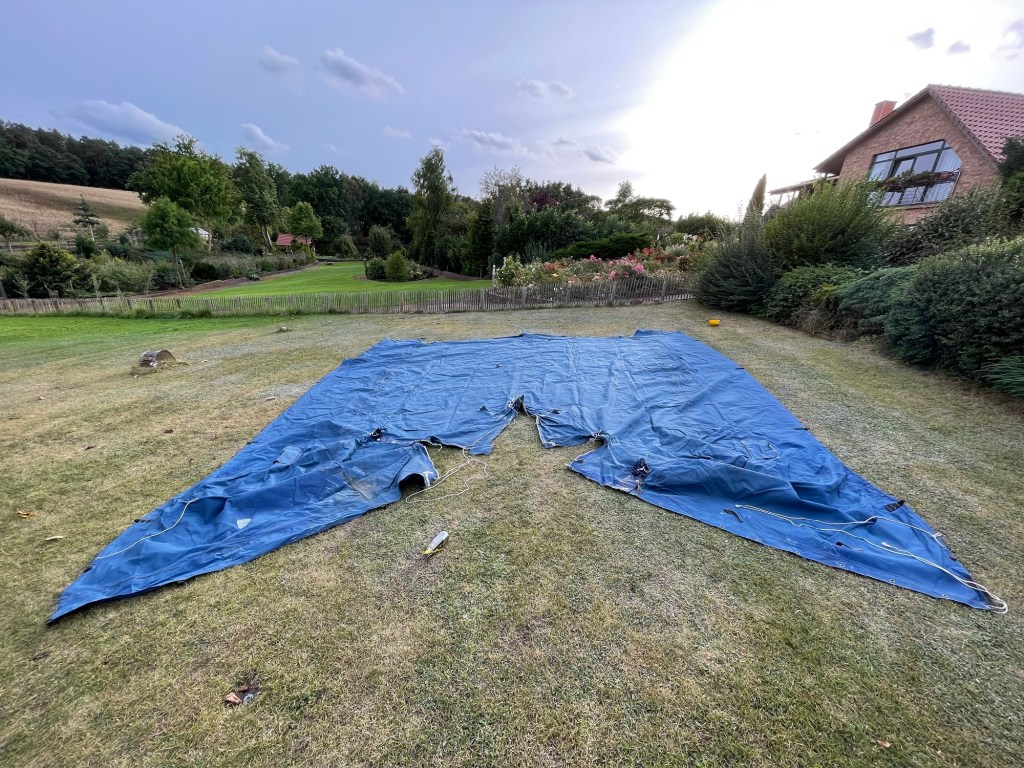 Gestern waren wir nun nochmal am Schiff, um die Winterplane anzubringen. Auch hier gibt’s eine Neuerung. Während unseres Sommertörns in Dänemark sprachen uns die Ersteigner unseres Schiffes an, die dort zufällig durch den Hafen spazierten. Sie hatten in einem Schuppen seit vielen Jahren noch eine maßangefertigte Winterpersenning liegen und lange vergessen. Diese konnte ich nun kostenfrei übernehmen und aus dem Dornröschenschlaf holen. Das Abholen der beiden schweren Persenningteile aus Schleswig Holstein erledigte für uns Martin von meiner Herrentagscrew. Besten Dank nochmal für den Schwerlasttransport. Zuhause auf dem Rasen ausgebreitet, wurden die Dimensionen sichtbar und auch ein paar kleinere Schäden durch den Zahn der Zeit.