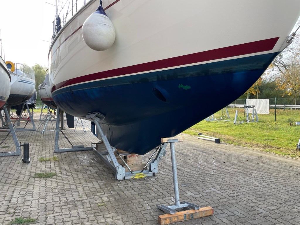 Nun steht die Puffin sicher auf einem Lagerbock, der hier auch besser zur Bootsgröße passt und schonender am Rumpf anliegt.