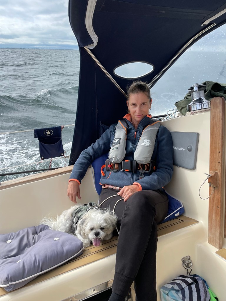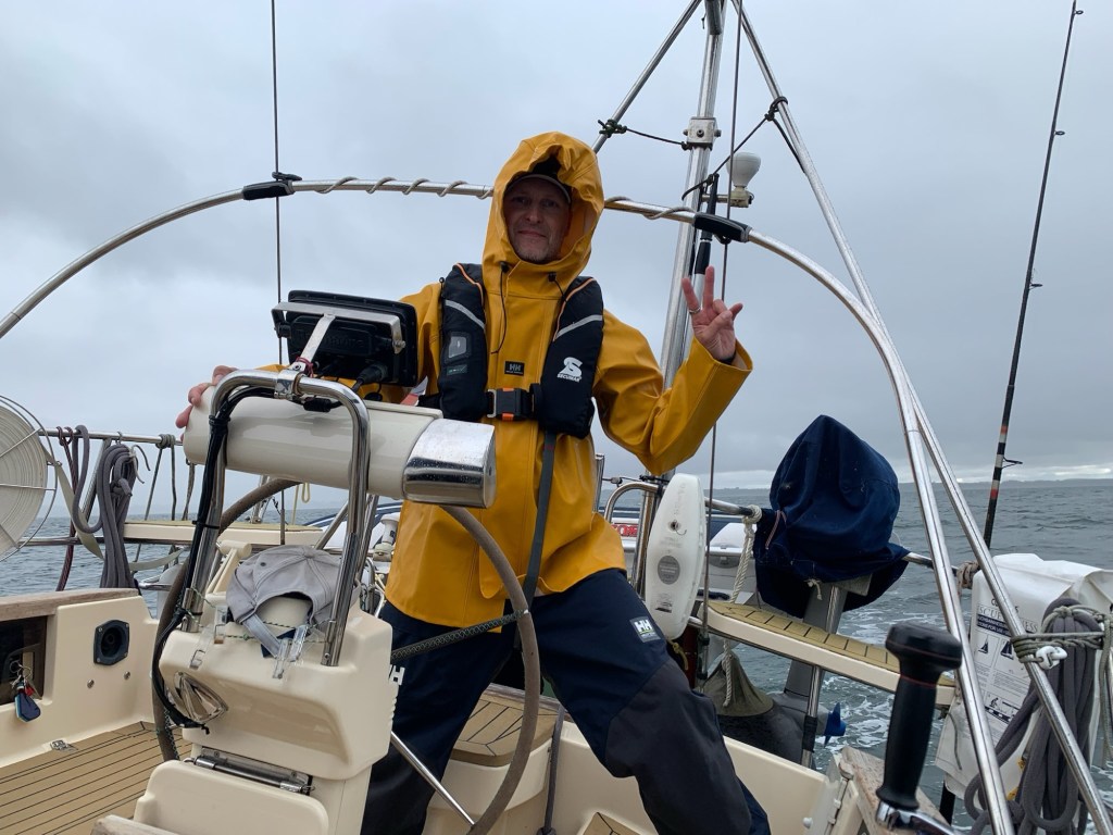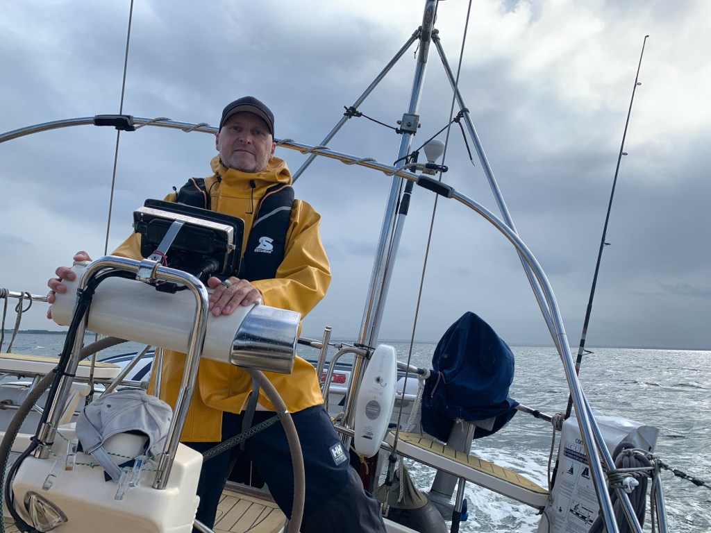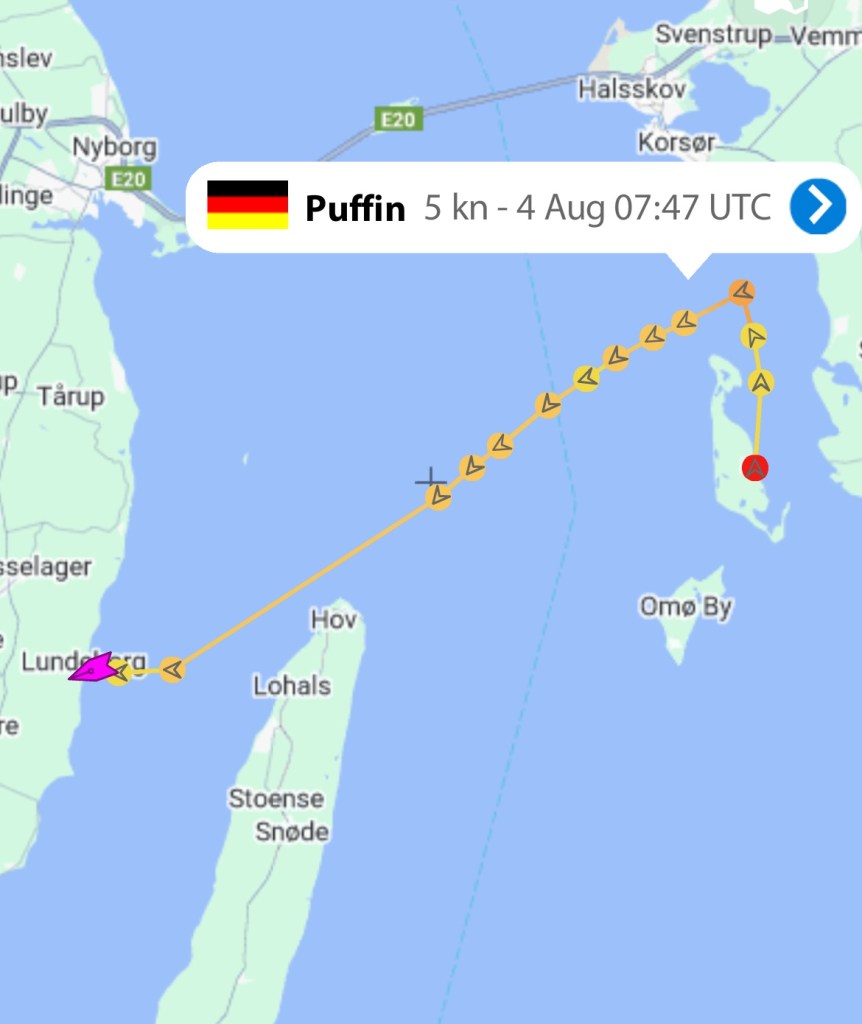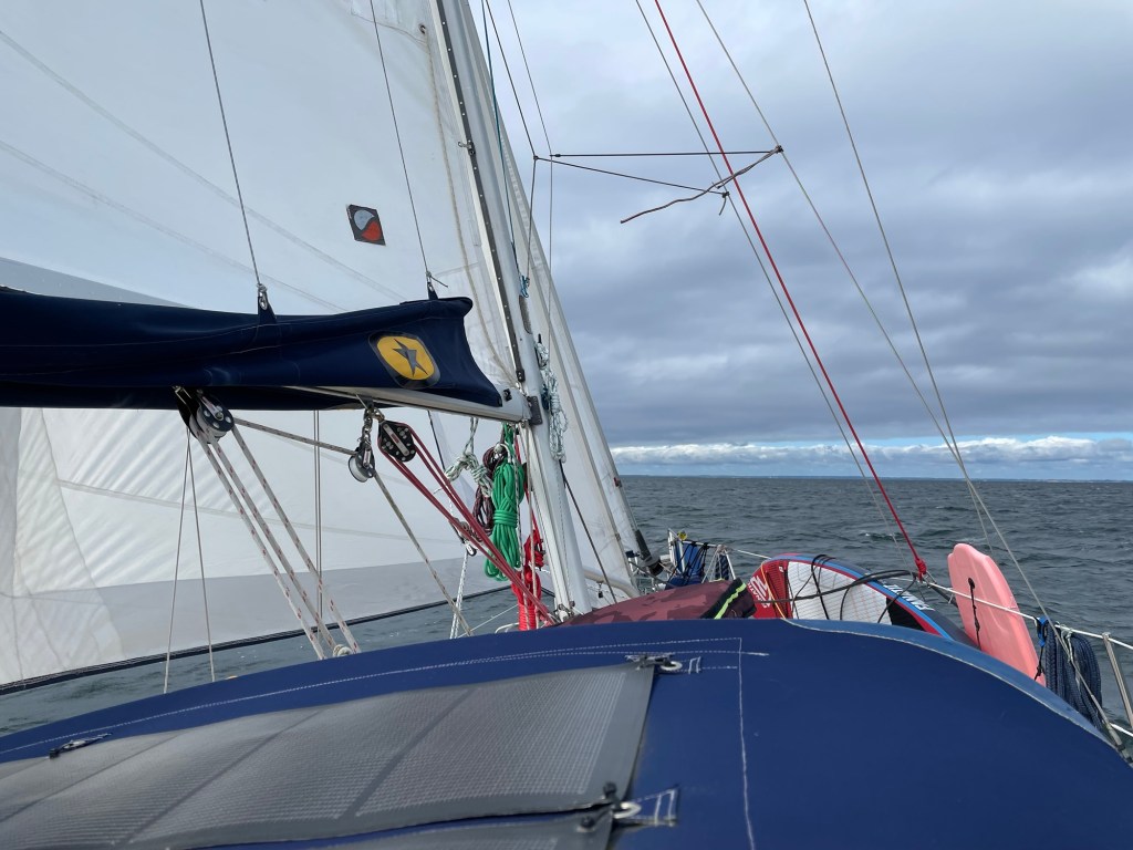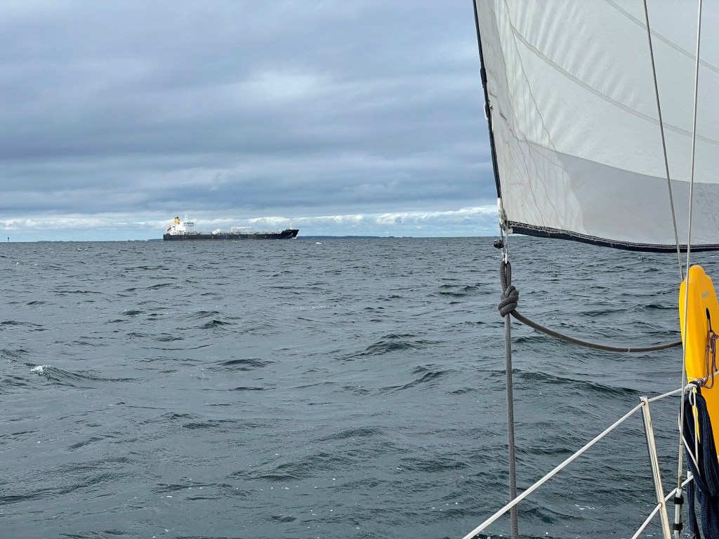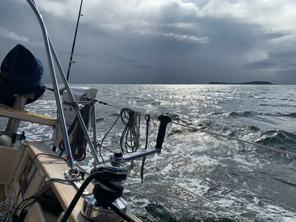 Wir wenden uns nutzen erstmal nur Großsegel und die kleine Fock zum Abwettern. Als der Regen durch ist und der Himmel freundlich aussieht, nimmt auch der Wind ab. Die Genua darf wieder mithelfen. Hoch am Wind queren wir den großen Belt und die Frachterautobahn.